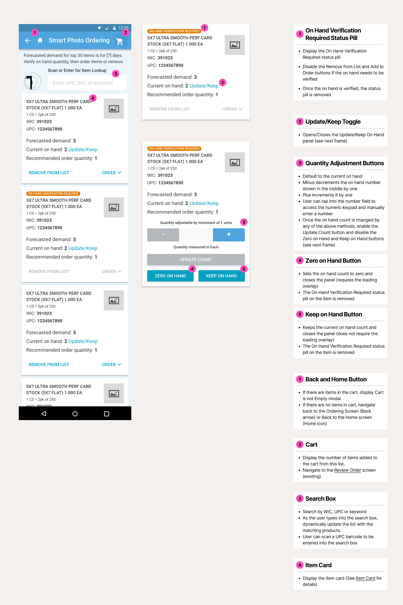 A detailed mockup and functional specifications showing the smart photo material order list.