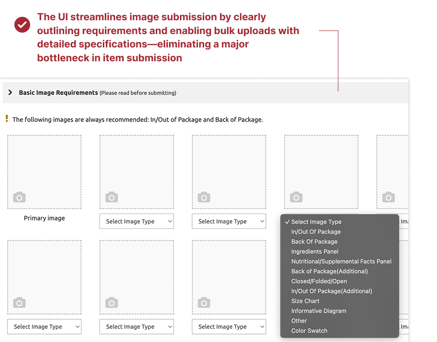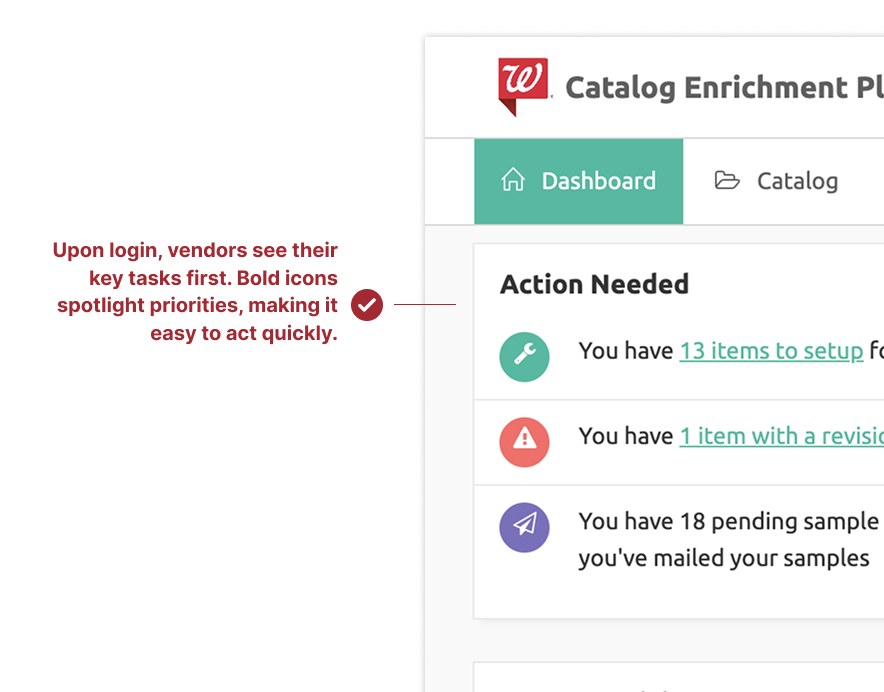 The process for vendors to set up products on Walgreens.com and the app was a significant bottleneck. Hundreds of vendors faced a time-consuming, error-prone, and highly manual onboarding process. Getting items onto the digital catalog required numerous steps across disconnected channels: Manual submission and approval of images, product descriptions, and metadata; Shipping and review of physical samples; Managing revisions and approvals via email, spreadsheets, and multiple legacy systems.