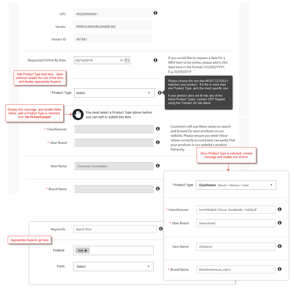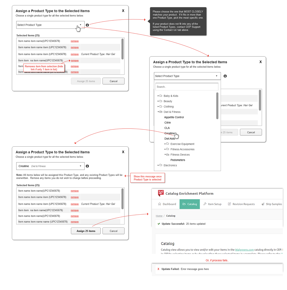 This wireframe details the UI for product type assignment, illustrating how we build the metadata foundation that powers superior search and discovery. This crucial step is key to helping shoppers quickly navigate a catalog of tens of thousands of items: