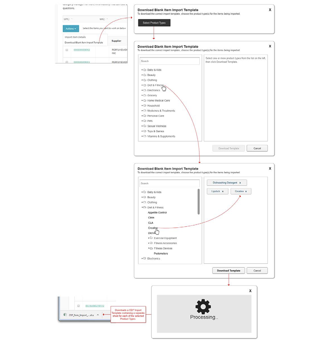 This wireframe illustrates the process of downloading an item import spreadsheet, enabling Walgreens vendors to batch upload metadata for many products at a time: