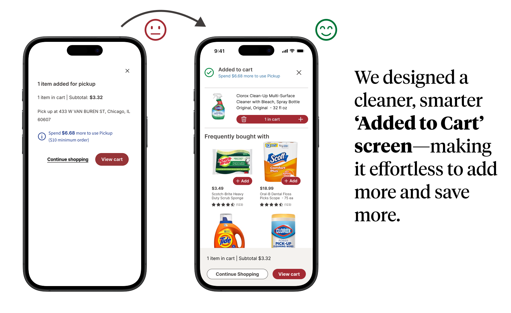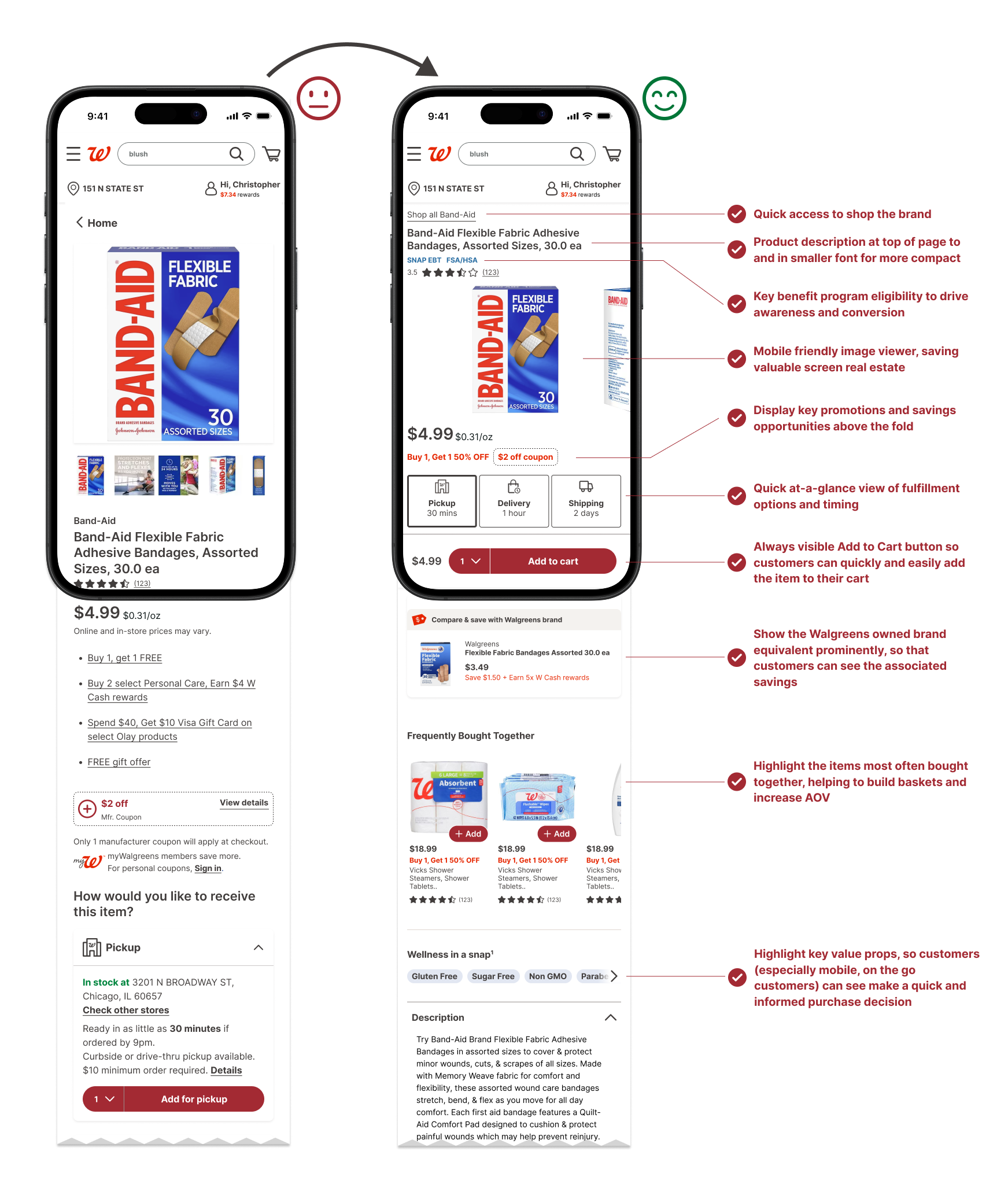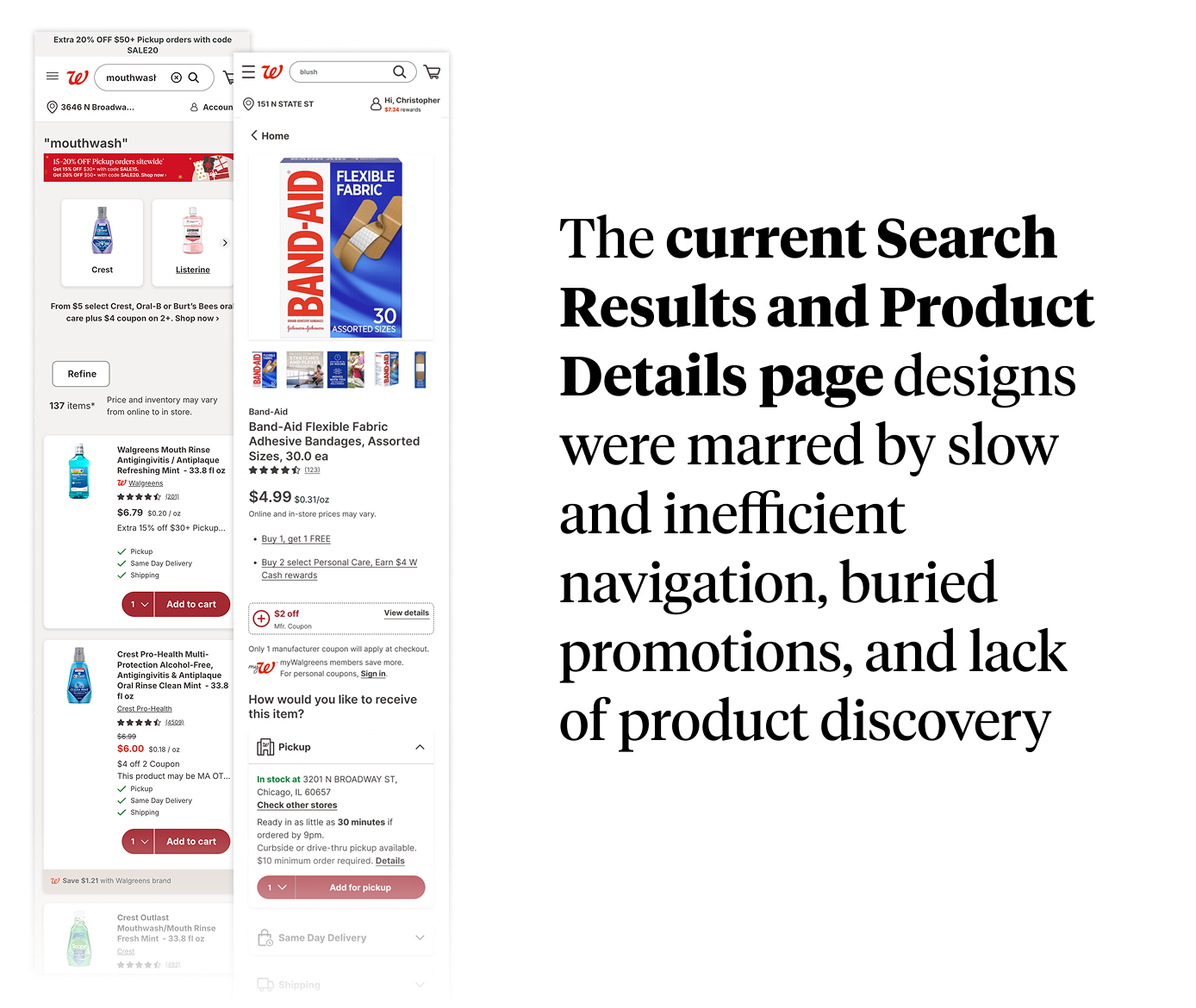 We hypothesized that underperformance—especially on mobile—stemmed from excessive scrolling, redundant clutter, and small product images that obscured recognizable packaging. Furthermore, key actions like Add to Cart and Clip Coupon were non-intuitive or hidden, while sales and promotions lacked visibility. Navigation and filters required too many steps to access, while misaligned pricing made comparison difficult, causing us to miss opportunities to surface relevant recommendations.